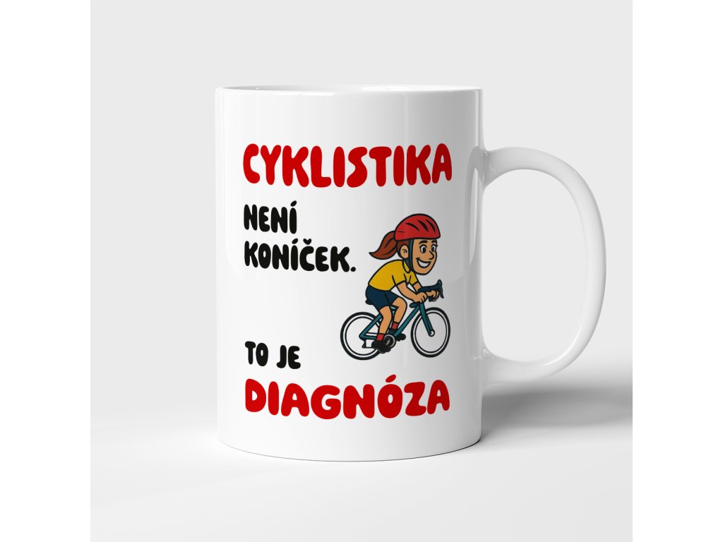 Keramický hrnek s motivem cyklistky a nápisem „Cyklistika není koníček, to je diagnóza“. Skvělý dárek pro cyklistky a milovnice kávy. Objem 330 ml, vhodný do myčky i mikrovlnky.